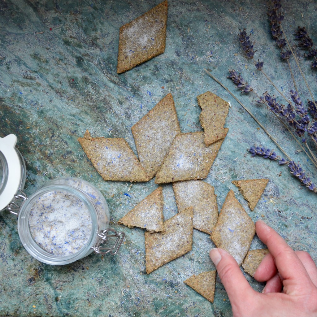 Mandelcracker mit Lavendelsalz Ooooh ich liebe diese Cracker 💜. Sie sind nussig und knusprig. Das zarte Lavendelaroma bringt einen mediterranen Flair in meine Küche und die Blüten harmonieren erstaunlich gut mit dem Salz. (…und bei all dem sind sie übrigens auch noch vegan und glutenfrei!) 3/4 Tasse Mandelmehl 2/3 Tasse Maisstärke 2 TL gemahlene Leinsamen 1 TL Meersalz 1/8 TL Backpulver 2 EL Olivenöl 3/4 TL Ahornsirup 2 ½ EL Wasser ½ TL gemahlene Lavendelblüten 1 TL Brennesselpulver, falls vorhanden Lavendelsalz zum Bestreuen.