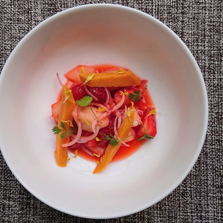 Ceviche ist ein traditionelles südamerikanisches Gericht, das urpsrünglich mit rohem Fisch zubereitet wird und bereits aus präkolumbiansichen Zeiten stammt. Das Herzstück ist ein Dressing auf Basis von Limetten, welches als Tigermilch bezeichnet wird und dem große, gesundheitsfördernde Kräfte nachgesagt werden. Bei der Zubereitung des Ceviche werden die Eiweiße des Fischs durch die starke Säure denaturiert- ein Prozess, der dem des Kochens ähnlich ist. der Koch Yahir Barrios hat, inspiriert von meinem Wildrosensalz, für uns eine vegane Variante des Ceviche entwickelt, das erfrischend und kühlend und perfekt für den Sommer ist.